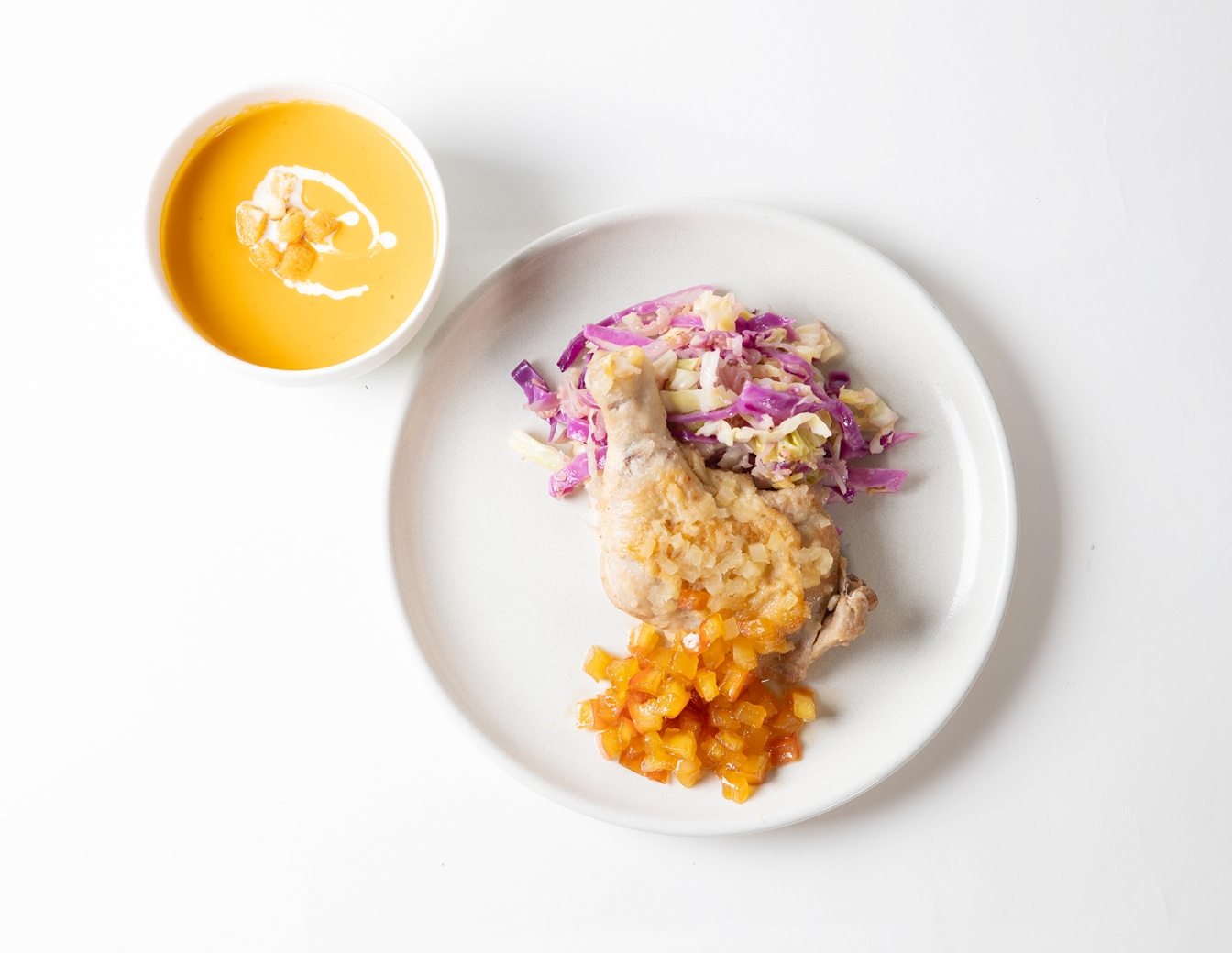アメリカで伝統的な飲み物「アップルサイダー」をイメージにしたアップルソース。干し海老で香り高いの海老のビスク。