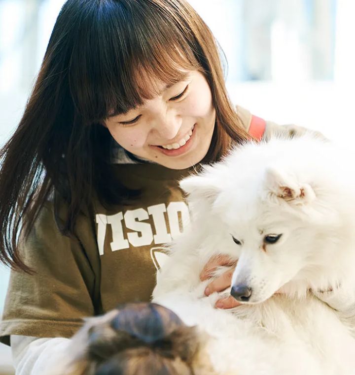 専攻問わず、校舎内であらゆる種類の動物たちを学⽣たち⾃⾝で飼育しています。⽇常的に動物と触れ合いケアすることで、卒業後、現場で⽣きる対応⼒を⾝につけます。